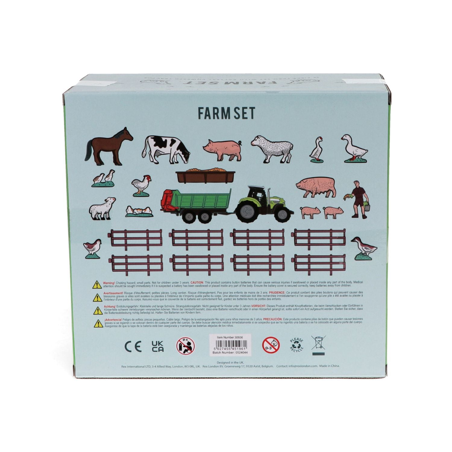 This 28-piece farm playset is designed to spark children's creativity as they imagine managing their own farm. It features a tractor with realistic engine sounds and flashing lights activated by a button, powered by included batteries. The set also includes a universal spreader trailer, eight connectable fence pieces to create various pen shapes, a feeding trough with animal feed, and a collection of farm animals like a horse, cow, sheep, pigs, chickens, and ducks, along with a farmer figure. Packaged in a printed card box, it is recommended for children over 3 years due to small battery parts.