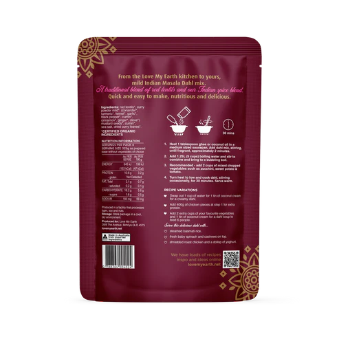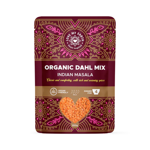 From the LoveMyEarth kitchen to yours, mild Indian Masala Dahl mix. A traditional blend of red lentils and our Indian spice mix. Quick and easy to make, nutritious and delicious.