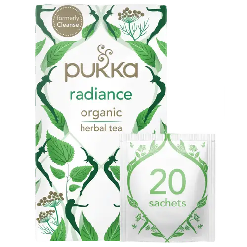 Glow from the inside out. It starts with a cup of herbal goodness, fresh with nature's green riches: FairWild nettle leaf, dandelion root and fennel seed, cooled with peppermint and aloe vera. It ends with a glow that flows into the sparkle of your eyes and the beauty of your skin. To Purity..