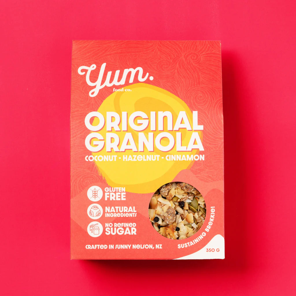 Yum Original Granola is a wholesome, grain-free blend crafted from organic ingredients that deliver both great taste and nutrition. This 350g pack features toasted coconut, crunchy hazelnuts, sweet currants, and chia seeds, all lightly sweetened with a touch of honey. Enhanced with coconut oil and cinnamon, it offers a rich flavor profile alongside health benefits that support your body and brain. Perfect for a nourishing breakfast or snack, this granola provides a satisfying crunch and natural energy to keep you going throughout the day. Enjoy a delicious way to fuel your wellness journey.